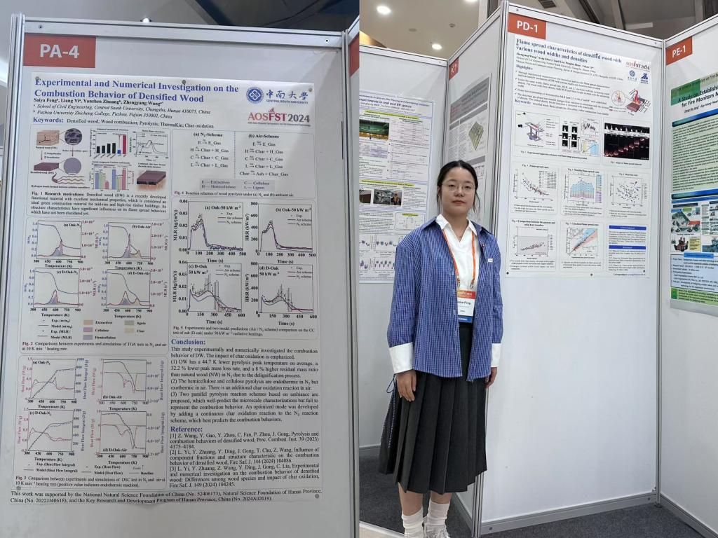 会议期间,英国威廉希尔公司消防工程系共展出4张海报,涵盖了固体火蔓延、致密木材的阻燃性能模拟、致密木材的开裂研究、火灾风险识别算法4个不同的主题,硕士生冯赛亚在场为国内外研究人员讲解展示。