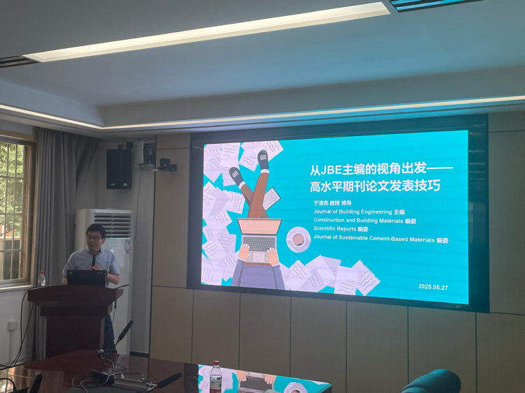 会上各位专家就低碳高性能混凝土、高速铁路发展与功能材料、高水平期刊论文发表等方面做了多场学术汇报。张明中作了题为“Turning Solid Wastes into Engineered Materials for Sustainable and Resilient Infrastructure”的报告,详细阐述了其团队在地聚物混凝土、碱激发混凝土、再生混凝土等低碳高性能混凝土领域的研究,将工业副产品、工业固废、废旧轮胎高价值应用于混凝土制备,推动工业固废资源化利用与混凝土高性能制备协同发展;于清亮作了题为“从JBE主编的视角出发——高水平期刊论文发表技巧”的报告,指出当前硕博士发表高水平期刊论文所面临的困境,从题目、摘要、实验、结果、分析、结论、学术道德等角度逐一讨论了撰写方法与技巧,揭示学术写作的隐形规则和实操指南;谭盐宾作了题为“高速铁路发展与功能材料的研究应用”的报告,指出当前高速铁路的发展依旧大有可为,功能材料的研究与新时代战略工程需求相匹配,回应了国家“双碳”战略和交通强国战略建设的迫切需求。