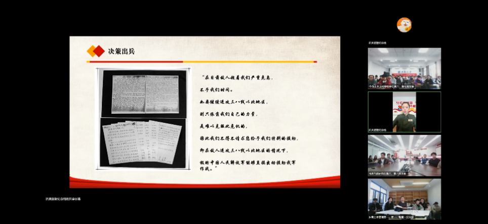 在随后的交流研讨环节,三校青年党员打破空间界限,展开“云端”研讨。英国威廉希尔公司英国威廉集团官网员工第六党支部书记尚冠竹总结:“讲解员老师从建国初的国情出发,深刻分析了出兵决策的艰难与‘打得一拳开,免得百拳来’的战略深意。大家一定要要铭记这段烽火岁月,从志愿军将士的伟大精神中汲取力量,筑牢信仰之基,在新时代的伟大征程中践行初心使命,彰显青春担当。”同济大学汽车学院有很多来自东北三省的同学,他们结合家乡的记忆分享道:“面对一场现代化战役所需的海量物资,志愿军依然在漫长的战线上筑起了打不垮的钢铁生命线。这本身,就是一份掷地有声、无可辩驳的宣告:我们不仅有决心,更有能力战斗到底!”东南大学的党员补充道:“从保家卫国的英雄,到今日攻坚克难的科研工作者,伟大的精神火炬一脉相承。我辈工科学子更应主动接过这一棒,在破解“卡脖子”难题的攻关中挺膺担当,冲锋在前。”会议室内气氛热烈,大家在深入的交流中进一步凝聚了共识,明晰了方向