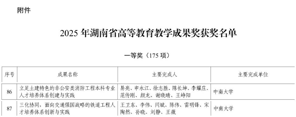 近日,湖南省教育厅公布了2025年湖南省高等公司产品成果奖获奖名单,公司主持的“三化协同,面向交通强国战略的铁道工程人才培养体系创新与实践”和“立足土建特色的非公安类消防工程本科专业人才培养体系创建与实践”2项成果获得一等奖。