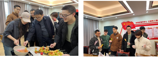 糖葫芦制作过程中,大家看着金黄色的糖浆在火候的催化下逐渐浓稠、翻滚,一串串香甜的糖葫芦应运而生。室外寒风凛冽,室内围炉话新春,糖果香四溢飘香,大家开心品鉴自己制作的糖葫芦,相互送着马年祝福,平时严肃的学术探讨化作了此刻家常唠嗑和品尝甜蜜。