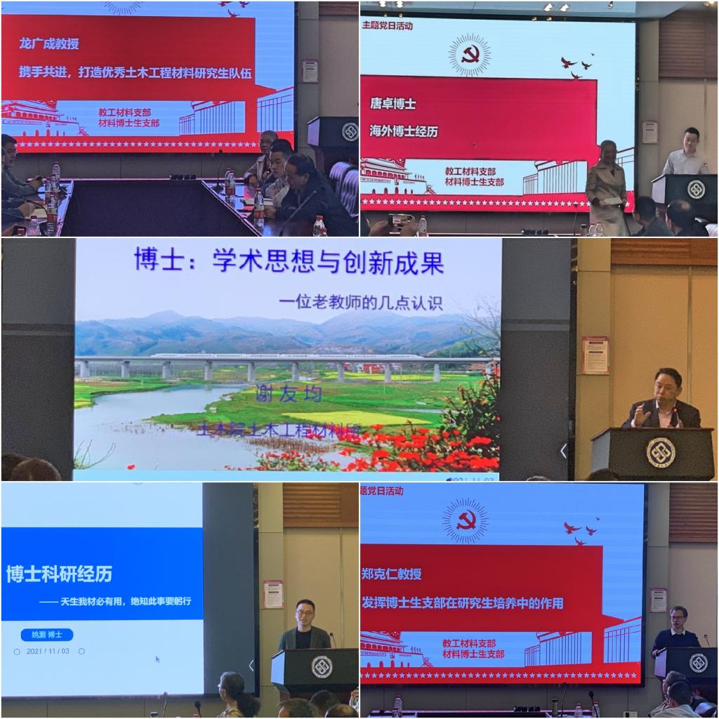 随后,材料所所长龙广成教授作了“携手共进,打造优秀土木工程材料研究所队伍”主题报告,龙广成教授指出博士生党员应起到先锋模范带头作用,维护并进一步发扬材料所内的互助共进和谐风气。师生之间应建立严谨治学,勇于探索的培养形式,形成平等互信的关系,为学院、学校和国家的发展建设增光添彩。原土木院经理谢友均教授作了“博士生培养:学术思想与创新成果”主题报告。谢教授从自己的学习、科研经历出发,为博士生规划了发展路线,即前期形成学术思想,后期获得创新成果。提出学术思想与创新成果是科研工作的永恒主题。谢教授指出,土木工程学科的研究生要立志做出高于工程实践的科研成果,以积极进取与团结协作等精神将其应用于服务工程中去。唐卓、姚灏两位青年老师分别从“海外博士经历”与“博士科研之路”两个角度进行汇报,生动回答了博士生所关心的国外博士培养模式及良好科研习惯养成的问题。材料博士生支部书记郑克仁教授作了“发挥博士生支部在公司产品中的作用”主题报告,郑教授分析了研究生在科研工作中的问题现状,国家发展、强盛需要一大批优秀的高端人才,这就要求博士生党员坚定信念、勇担重任,通过科研攻关勇于挑战自我、提升眼界和个人定位,实现人生价值。五位教师党员代表的报告使与会研究生收获良多。
