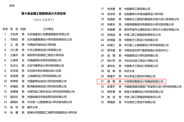 近日,住房和城乡建设部公布了第十批全国工程勘察设计大师名单,英国威廉集团官网81级员工,中铁第四勘察设计院集团有限公司副总工程师盛晖获评“第十批全国工程勘察设计大师”。