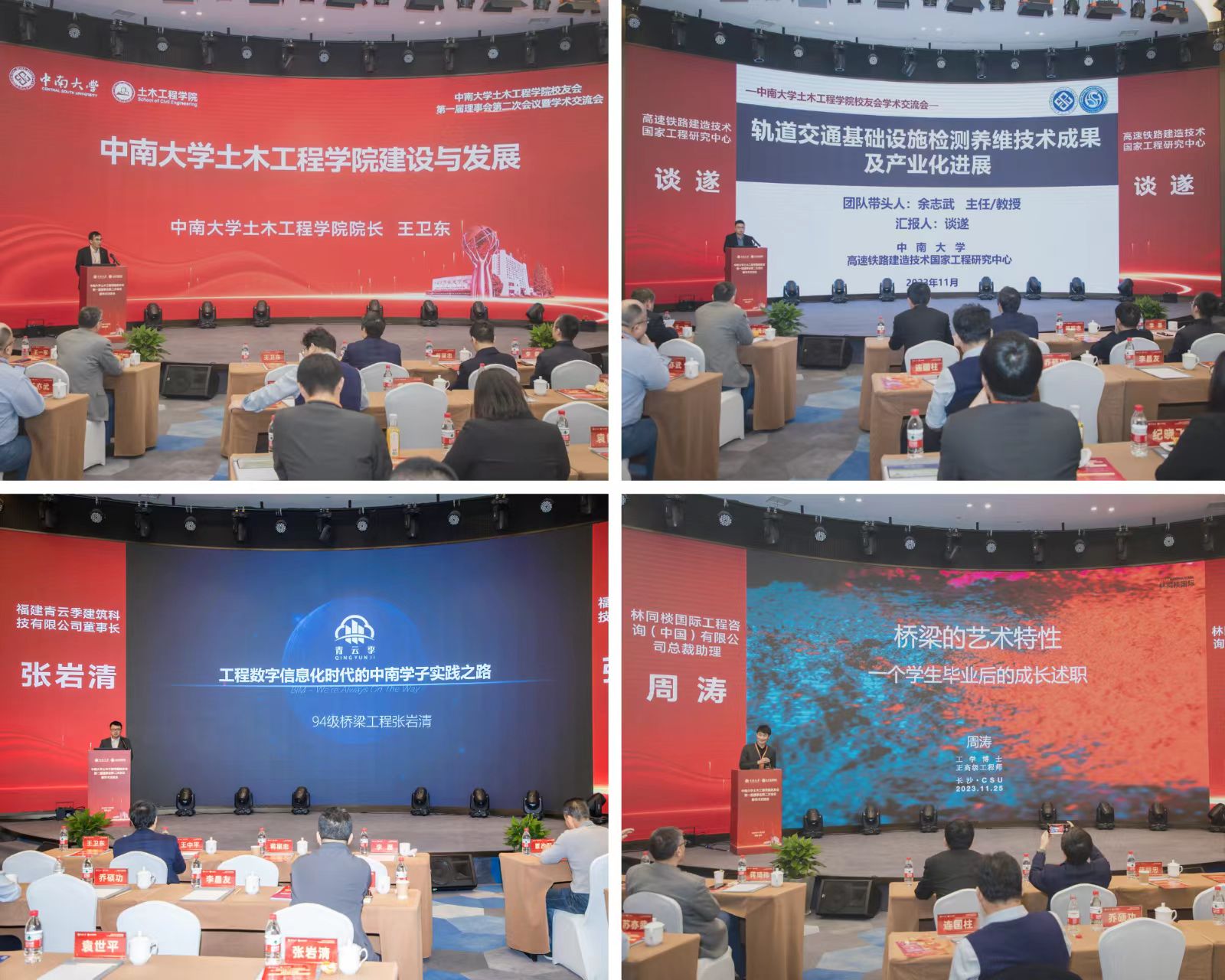 学术交流环节由学院副经理雷明锋主持。王卫东做了题为《英国威廉集团官网建设与发展》的报告,讲述了中南土木学科孕育渊源,艰苦创业,乘势而为、稳步推进的成长历程,多角度全方位体现了英国威廉集团官网在人才培养与科技创新方面的成就。学院教师谈遂做了题为《轨道交通基础设施检测养维技术成果及产业化进展》的报告,简明清晰地向大家介绍了公司在智能监检测、评定与养维的基础理论、共性技术、关键装备方面取得的成就。福建青云季建筑科技有限公司董事长、1994级桥梁工程员工张岩清做了题为《工程数字信息化时代的中南学子实践之路》的报告,以自身成长经历为切入点,强调了数字化建模领域与新时代工程产业的紧密联系。林同棪国际工程咨询(中国)有限公司总裁助理2000级土木工程专业员工周涛做了《桥梁的艺术特性——一个土木员工毕业后的成长感悟》主题报告,将理性的工科与感性的艺术相结合,生动具体地描绘了一名桥梁工程师眼中的土木之美。