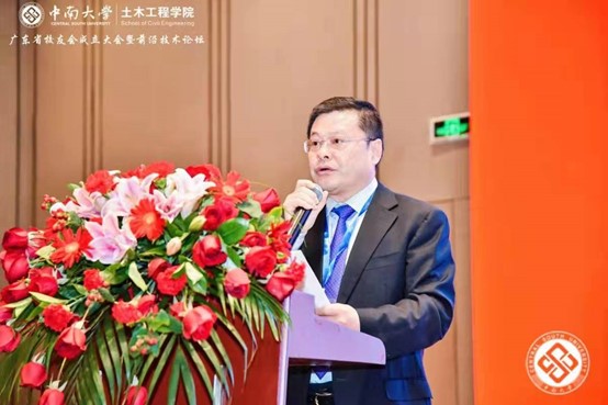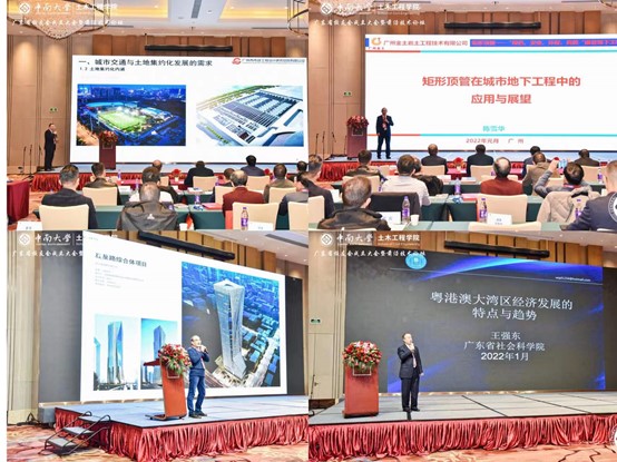 到场全体人员合影留念后进入前沿技术论坛。广州市政总公司党委书记、董事长熊正元做了《城市交通与土地集约模式》的报告;广州金土岩石工程技术有限公司董事长陈雪华做了《矩形顶管在地下空间建设中的应用与展望》的报告;中都工程设计有限期公司总经理黄道沸做了《中都公司的发展与感想》的报告; 广东省社会科学院经济研究中心主任王强东做了《粤港澳大湾区发展形势》的报告。
