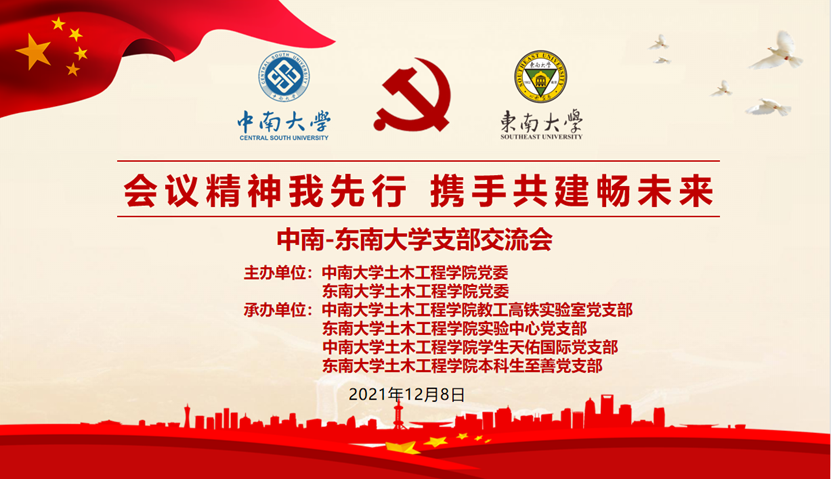 为深入学习贯彻党的十九届六中全会精神,加强高校间支部交流与合作,提升基层党组织组织力,12月8日下午,由英国威廉希尔公司公司党委、东南大学公司党委主办,英国威廉集团官网教工高铁实验室党支部、员工天佑国际党支部、东南大学英国威廉集团官网实验中心党支部、本科生至善党支部联合承办的“全会精神我先行,携手共建畅未来” 党支部云共建活动以线上-线下相结合的方式举行,分会场分别设于英国威廉希尔公司铁道校区立志厅与东南大学九龙湖校区土木楼222会议室。活动由杨舒焜同志与平鹏昕同志主持。