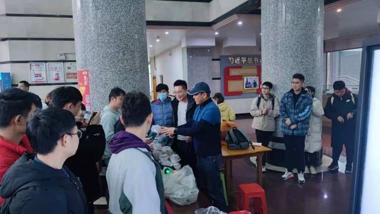 在铁道校区,领取饺子的队伍在世纪楼大厅排成了两条长队,公司党委书记蒋琦玮、经理何旭辉、党委副书记杨鹰在活动现场为大家发放饺子,杨鹰书记亲切的向大家表示了节日的问候,并向各位备战考研和备考期末的同学表达美好的祝福。