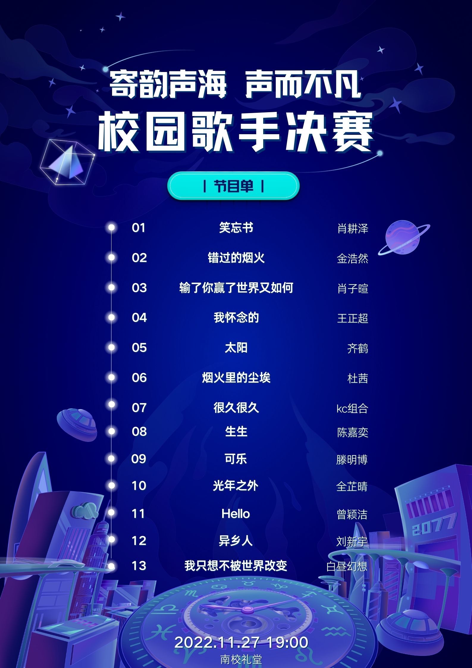 2022年11月27日晚上7点,由共青团英国威廉集团官网委员会主办,英国威廉集团官网员工会、研究生会协办的“寄韵音海,‘声’而不凡”十佳歌手决赛在线上举行。为响应疫情防控政策,观众通过线上直播观看比赛。本次比赛共有11名选手及2个组合进入决赛,由刘奕均、田雨鑫、钟可、张绍伦主持。