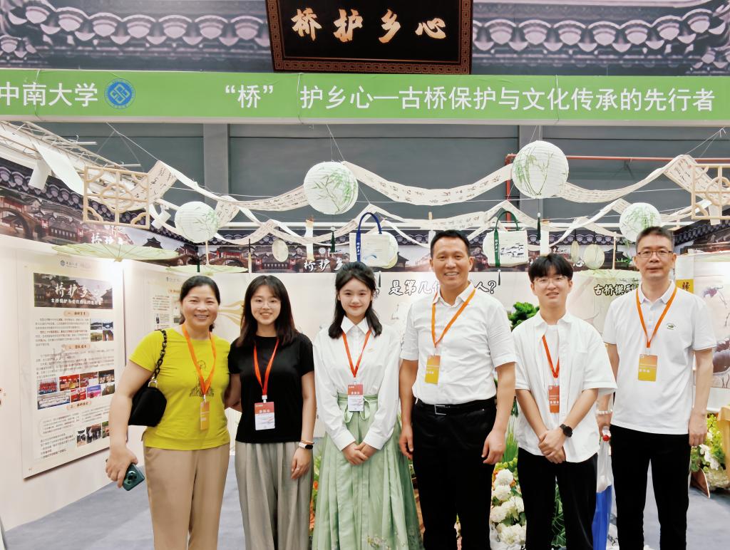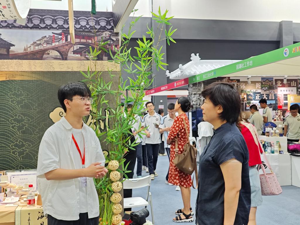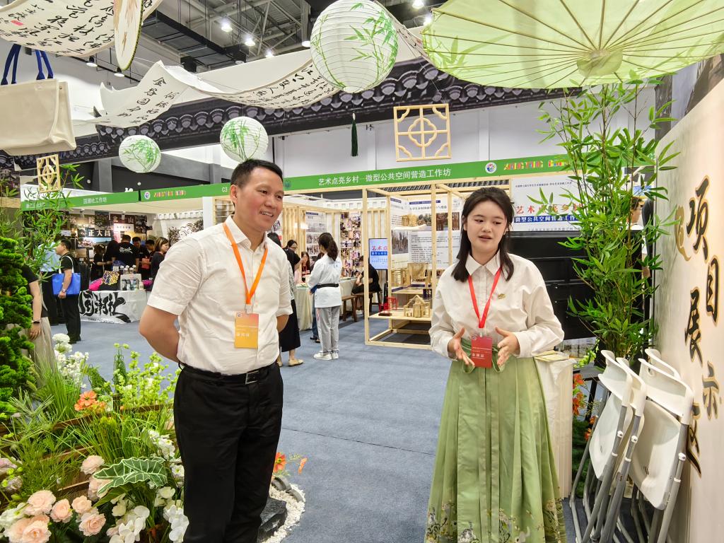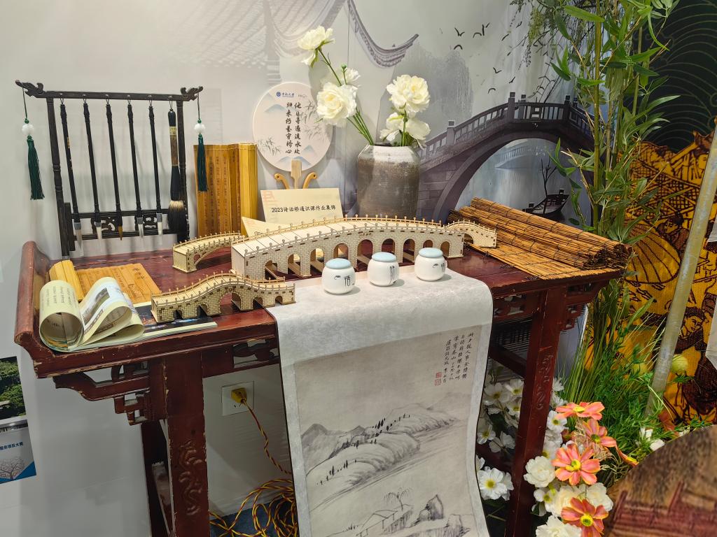 展厅一角,古色古香的桥梁与生意盎然的林艺相映生辉,“桥”护乡心——古桥保护与文化传承工作坊项目将古桥与乡村文化带入展演现场,成员以文创互动、系统讲解等形式展陈了团队丰富的实践成果,构建出富有古典美与生态美的古桥特色文化展区,参展八天来,深受观众喜爱。