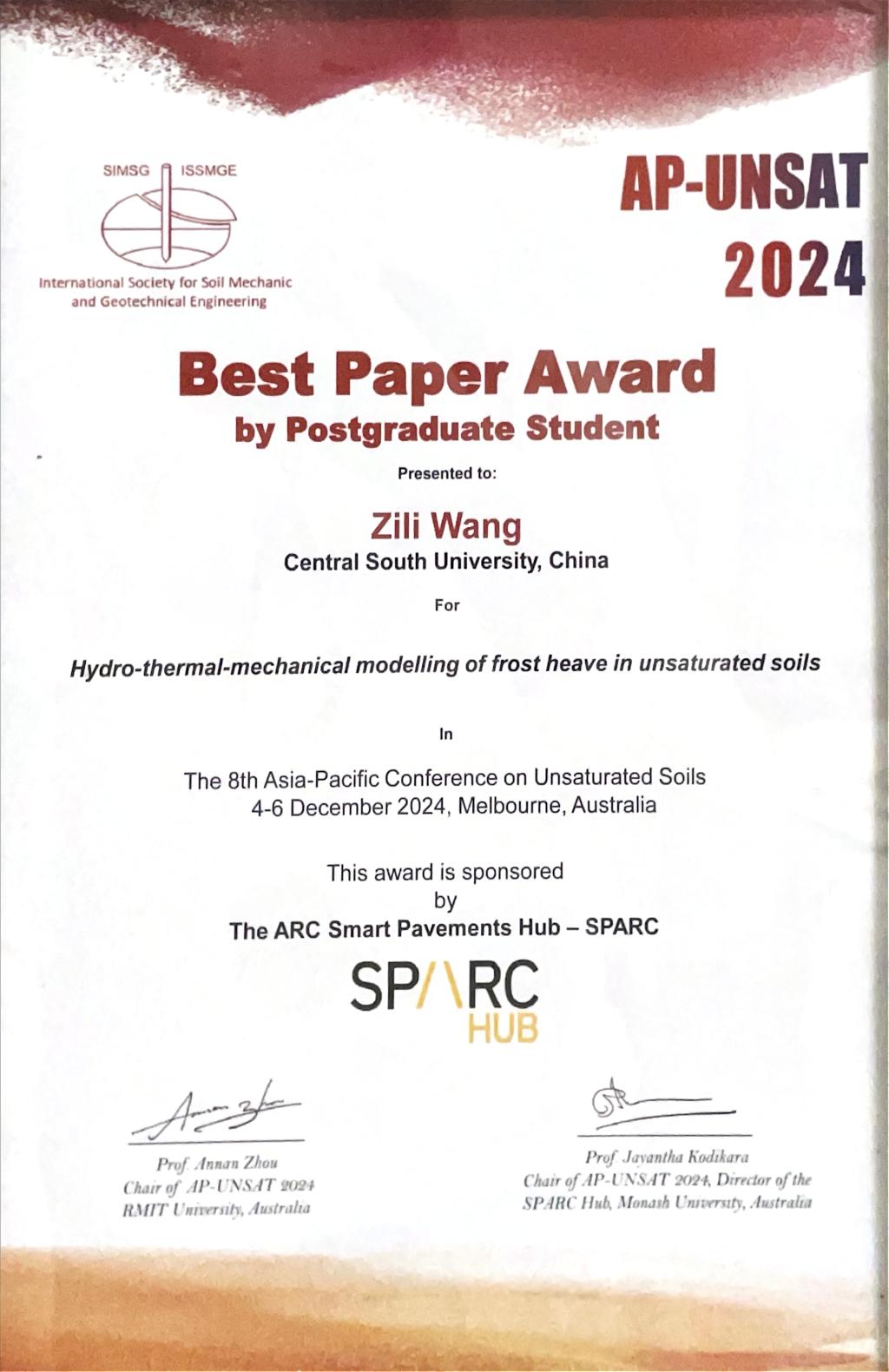 公司岩土工程系博士研究生王自力荣获2024年亚太非饱和土会议最佳论文奖