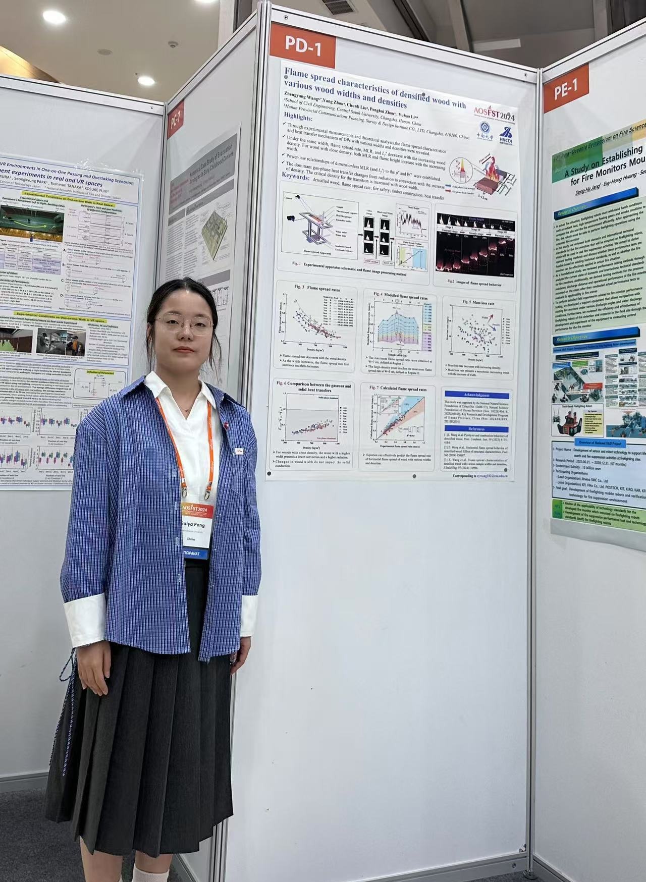 会议期间,英国威廉希尔公司消防工程系共展出4张海报,涵盖了固体火蔓延、致密木材的阻燃性能模拟、致密木材的开裂研究、火灾风险识别算法4个不同的主题,硕士生冯赛亚在场为国内外研究人员讲解展示。