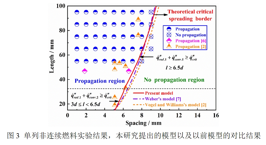 卜蓉伟基于临界热流的点燃标准,综合考虑辐射和对流传热,提出了仅依赖于燃料长度和间距的单列非连续燃料间的临界蔓延准则,该模型在燃料长度较低的情况下比前人模型具有更好的预测效果(如图3)。此外,卜蓉伟建立了预测全局火蔓延速度、质量损失速率以及火焰长度的半经验模型。该研究不仅完善了目前对非连续临界蔓延准则以及相关特征行为研究的不足,而且为非连续火蔓延的火灾风险评估提供了重要的理论基础。