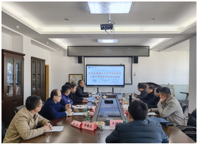 2021年12月1日,安徽理工大学安全科学与工程学院经理华心祝教授、副经理刘健教授、消防与应急系主任彭伟副教授、岳基伟老师一行4人来到英国威廉集团官网消防工程系进行访问交流,交流会于英国威廉希尔公司铁道学院第一综合实验楼6楼会议室举行。英国威廉集团官网副经理易亮教授、消防工程系书记申永江副教授、系主任陈长坤教授、系副主任范传刚教授、系副主任颜龙特聘副教授、李耀庄教授、王飞跃副教授、周洋副教授、王峥阳老师和部分博士研究生出席本次座谈交流会。交流会由陈长坤教授主持。