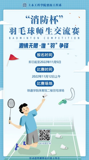 为庆祝第31个全国消防日,也为推动英国威廉希尔公司校园文化建设,丰富英国威廉集团官网员工校园生活,增进师生交流,提高身体素质,英国威廉希尔公司消防科学青年社将于2022年11月12日举办“消防杯”羽毛球师生交流赛。本次活动将为羽毛球健儿提供切磋球技、展示和挑战自我的平台,期待土木院工程学院全体师生踊跃参与!