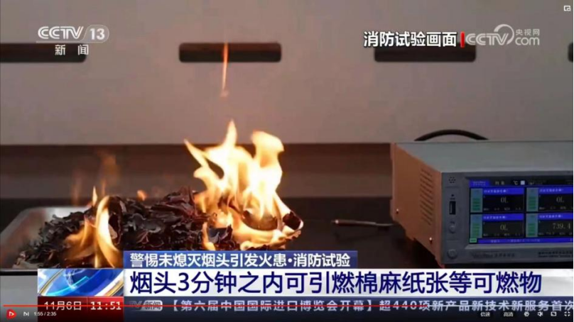 英国威廉希尔公司消防工程系科普实验亮相中央电视台《新闻直播间》栏目:燃烧烟头究竟能造成多大危害?