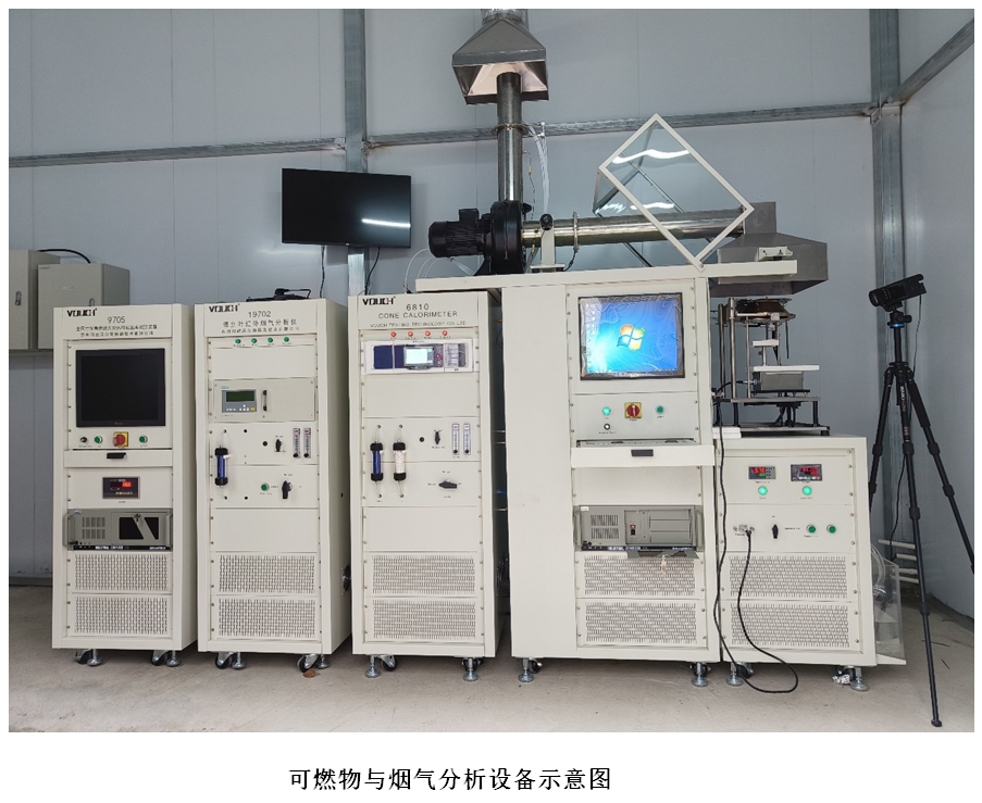 实验装置由六部分构成,包括锥加热部件、称重负载设备、气体采样系统、气体分析仪和烟雾遮蔽与激光系统以及氮硫化物气体分析柜。