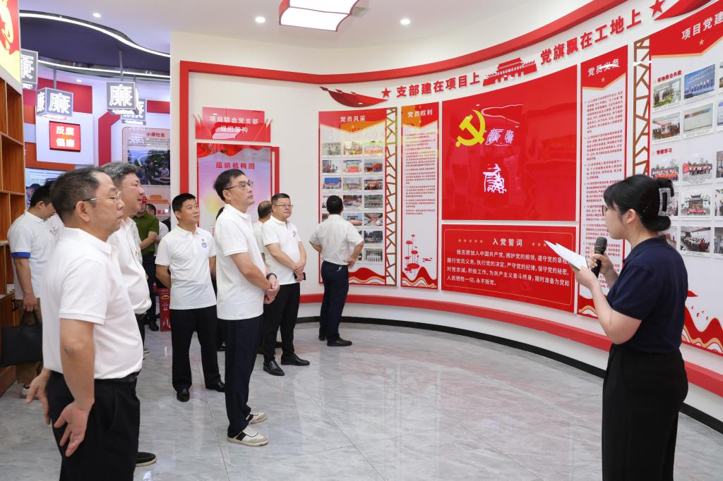 随后调研组抵达项目党建管理中心,深度学习和体验企业“党建+项目”品牌建设成果。馆内采用“智慧党建”形式,全景展现党的百年光辉历程、清廉文化、党建活动、企业文化、工程项目等内容,将党建工作开展与工程信息化管理相结合,实现了党建信息资源融合共享。