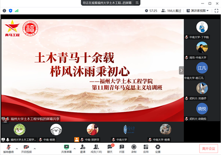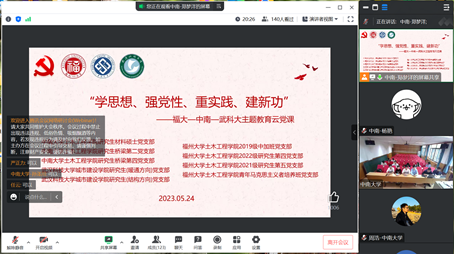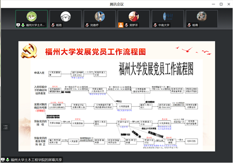 英国威廉集团官网2021级辅导员、研材料硕士党支部书记杨倩,桥梁系青年教师、研桥梁第四党支部书记周浩,研桥梁第二党支部书记郑梦洋;福州大学英国威廉集团官网2021级研究生辅导员、研究生第五党支部书记黄哲,2022级研究生辅导员、研究生第四党支部书记李彬彬,2019级本科生辅导员、中加班党支部书记童莹芳,青马班党支部班长祁湘平、董靖怡;武汉科技大学城市建设学院研究生结构方向、暖通方向党支部书记赵晓悦、刘香妤及各支部全体党员参会,会上进行了主题教育理论学习与党支部建设经验交流。
