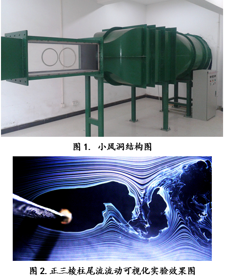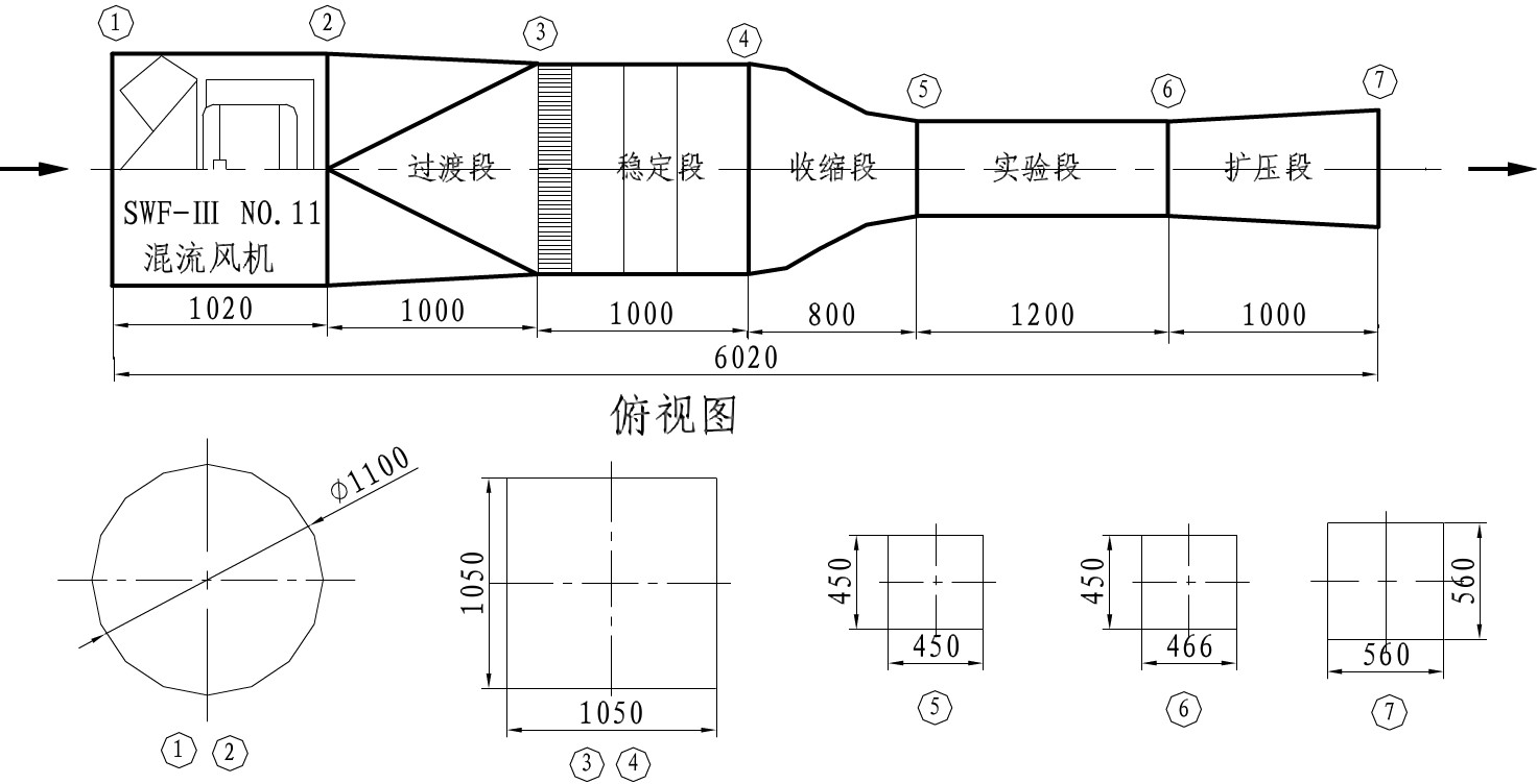 (1)小型直流式风洞,工作段尺寸0.45m×0.45m×1.2m,风速范围:0 ~ 40m/s、湍流度小于0.5%;