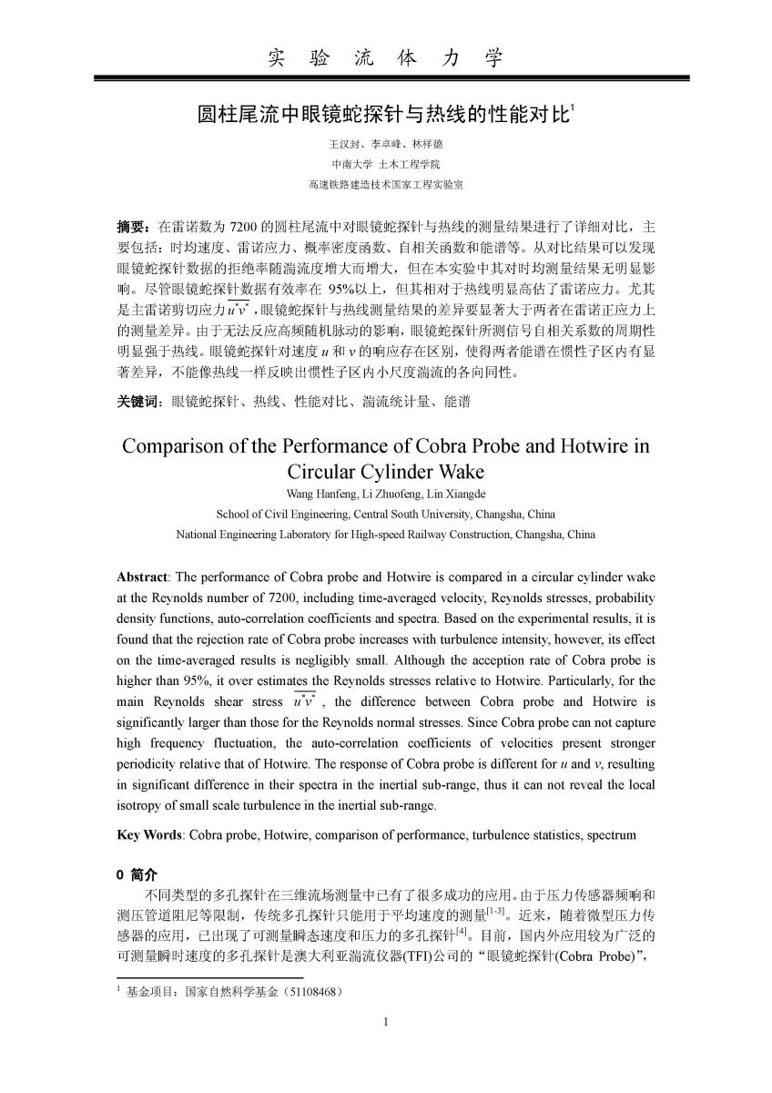 王汉封、李卓峰、林祥德.圆柱尾流中眼镜蛇探针与热线的性能对比,实验流体力学, 2014 Vol. 28 (5): 104-110